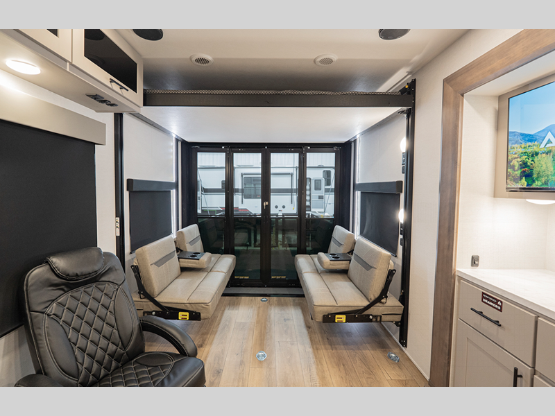 The 101" wide-body benchmark chassis provides plenty of space to bring along the dirt bikes, four-wheeler, or kayaks, and the Azdel-backed fiberglass sidewalls are ultra durable so you can enjoy your RV for years to come. You will appreciate the Garage Management System that includes a weather resistant ramp door, a fully insulated garage floor, and a multi-point tie-down system to keep your toys secure during transport. The interior will have you feeling at home with black cabinetry hardware, residential LED recessed ceiling lights, a large residential shower, and many more comforts.