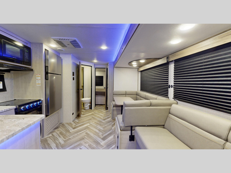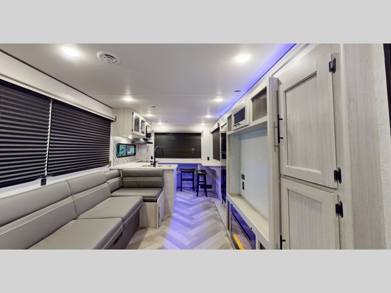 Sleeps 5 Slides 2 Length 33 ft 8 in Ext Height 11 ft 4 in Int Height 6 ft 9 in Hitch Weight 802 lbs Dry Weight 7550 lbs Cargo Capacity 2050 lbs Fresh Water Capacity 45 gals Grey Water Capacity 42 gals Black Water Capacity 42 gals Available Beds RV Queen Refrigerator Type 12 Volt Refrigerator Size 10 cu ft Cooktop Burners 3 Shower Size 34" LP Tank Capacity 20 lbs TV Info LR 39" TV Axle Count 2 Number of LP Tanks 2 Shower Type Radius Similar Floorplans