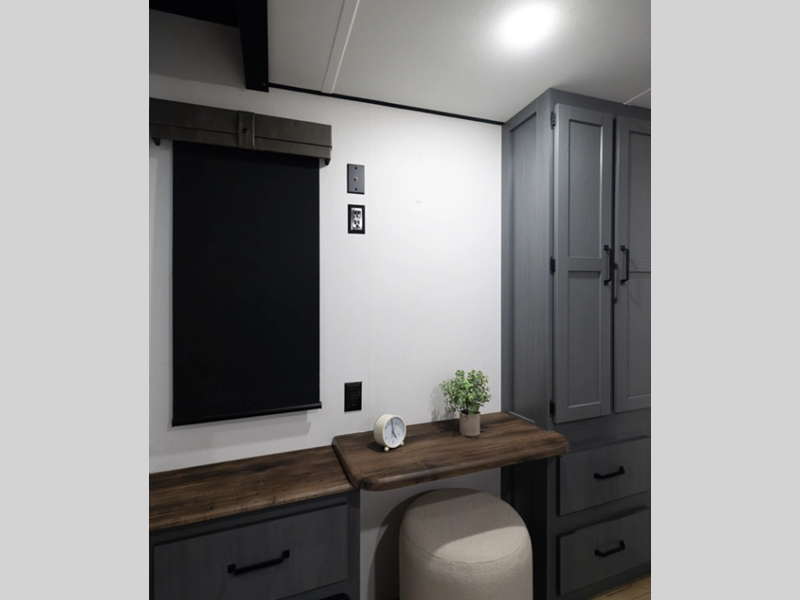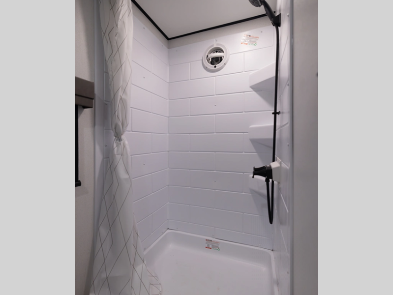 The Congoleum flooring inside is not only eye-catching, but also resilient and durable to withstand your adventurous lifestyle. There is a tankless water heater for added comfort, along with night roller shades, a residential-style refrigerator, and solid surface countertops.