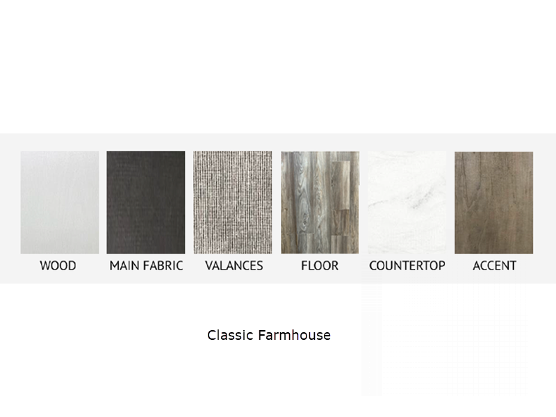 Sleeps 4 Slides 2 Length 33 ft 10 in Ext Width 8 ft 1 in Ext Height 11 ft 5 in Int Height 7 ft Interior Color Classic Farmhouse Hitch Weight 1000 lbs GVWR 10250 lbs Dry Weight 8200 lbs Cargo Capacity 2050 lbs Fresh Water Capacity 52 gals Grey Water Capacity 74 gals Black Water Capacity 37 gals Tire Size ST225/75R15'E Furnace BTU 35000 btu Available Beds Queen Refrigerator Type 12V Refrigerator Size 10 cu ft Cooktop Burners 3 Shower Size 30" x 36" Number of Awnings 1 LP Tank Capacity 30 lbs Water Heater Type Tankless AC BTU 15000 btu TV Info LR 40" 4K Ultra LED HD Smart TV Awning Info 21' Electric Axle Count 2 Washer/Dryer Available Yes Number of LP Tanks 2 Shower Type Standard Electrical Service 50 amp Similar Floorplans