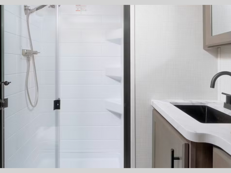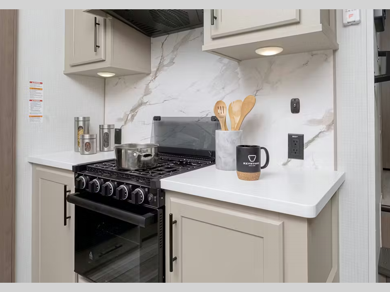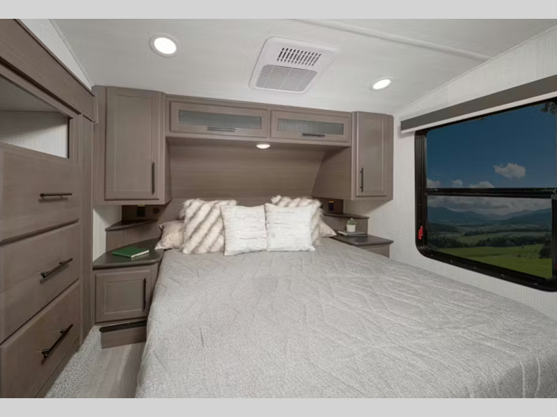 You'll be met with residential features inside, such as solid surface kitchen countertops, hardwood cabinet doors, dimmable lights in select areas, and more. The Climate Guard Protection Package will help extend your camping season so you can travel in colder months, and there are added safety features for your peace of mind.