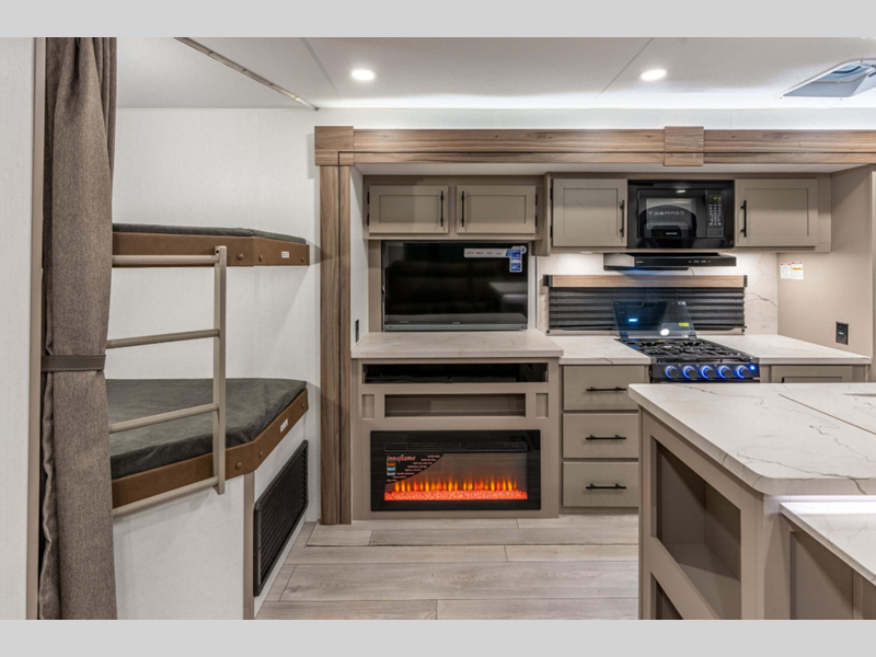 Sleeps 5 Slides 2 Length 30 ft Ext Width 8 ft Ext Height 11 ft 4 in Int Height 6 ft 10 in Interior Color Mink, Spice Film, Uni Sandgrau Hitch Weight 840 lbs GVWR 8800 lbs Dry Weight 7070 lbs Cargo Capacity 1730 lbs Fresh Water Capacity 45 gals Grey Water Capacity 64 gals Black Water Capacity 32 gals Tire Size 15" Furnace BTU 30000 btu Number Of Bunks 2 Available Beds King Refrigerator Type 12V Refrigerator Size 10 cu ft Cooktop Burners 3 Number of Awnings 1 Axle Weight 6230 lbs LP Tank Capacity 20 lbs Water Heater Type Tankless AC BTU 13500 btu TV Info LR LED TV Awning Info 19' Electric with LED Lights Axle Count 2 Number of LP Tanks 2 Shower Type Radius Electrical Service 50 amp Similar Floorplans