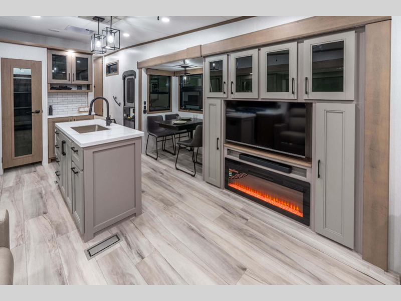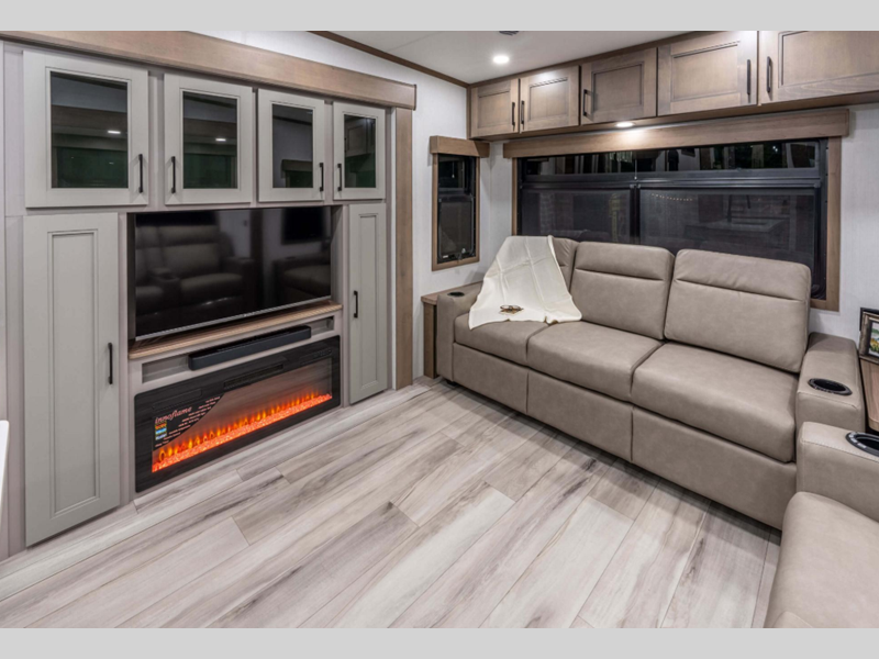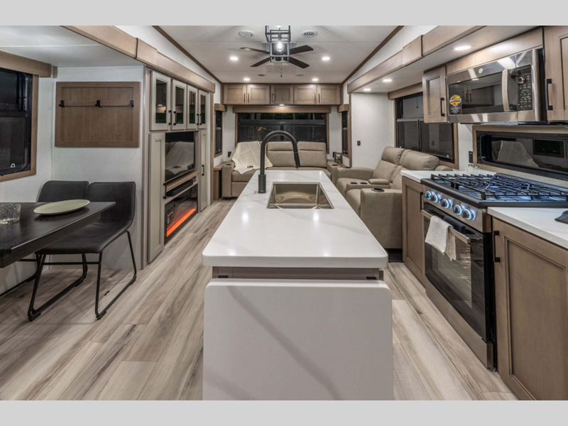 Sleeps 3 Slides 3 Length 37 ft 6 in Ext Width 8 ft Ext Height 12 ft 8 in Interior Color Mink, Pebble Hitch Weight 2190 lbs GVWR 13795 lbs Dry Weight 11770 lbs Cargo Capacity 2025 lbs Fresh Water Capacity 76 gals Grey Water Capacity 90 gals Black Water Capacity 50 gals Tire Size 16" Furnace BTU 35000 btu Available Beds King Refrigerator Type Residential Refrigerator Size 18 cu ft Convection Cooking Yes Cooktop Burners 4 Shower Size 30" x 36" Number of Awnings 1 Axle Weight 9580 lbs LP Tank Capacity 30 lbs Water Heater Type On Demand Tankless AC BTU 15000 btu TV Info LR 65" Smart LED TV Awning Info 16' Power w/LED Light Strip Axle Count 2 Washer/Dryer Available Yes Number of LP Tanks 2 Shower Type Shower w/Seat Electrical Service 50 amp Similar Floorplans