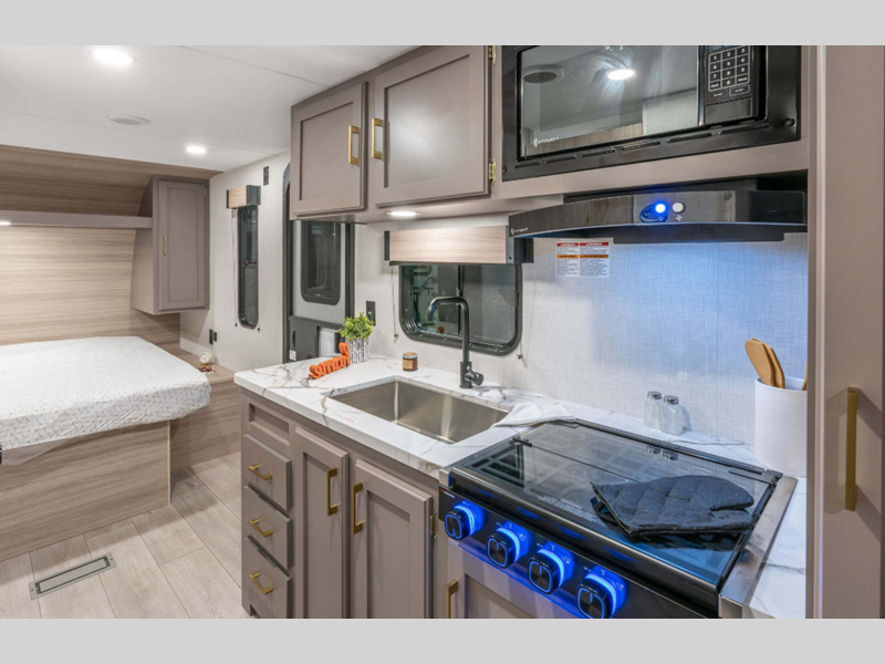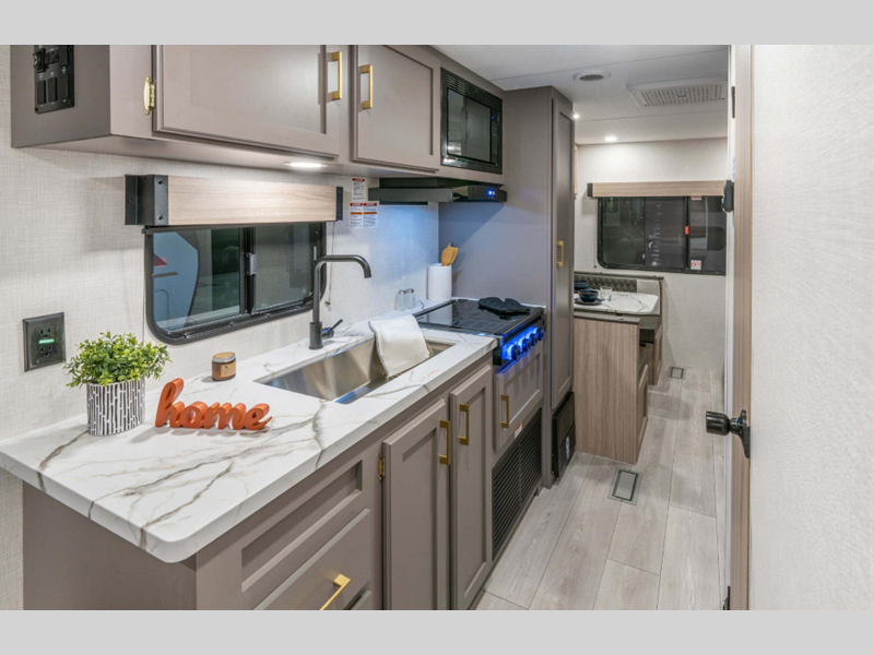 A tankless hot water heater will let you enjoy endless hot showers, and the RV Airflow A/C System with an air filter means you'll stay comfortable during the hot summer camping months. Each model also includes an aerodynamic front profile with a sleek smooth metal front, along with a two toned exterior metal that is sure to turn heads at the campground. There are seamless countertops with a stainless steel kitchen sink, residential grade linoleum, wider pocket/passage interior doors, plus many more comforts inside.